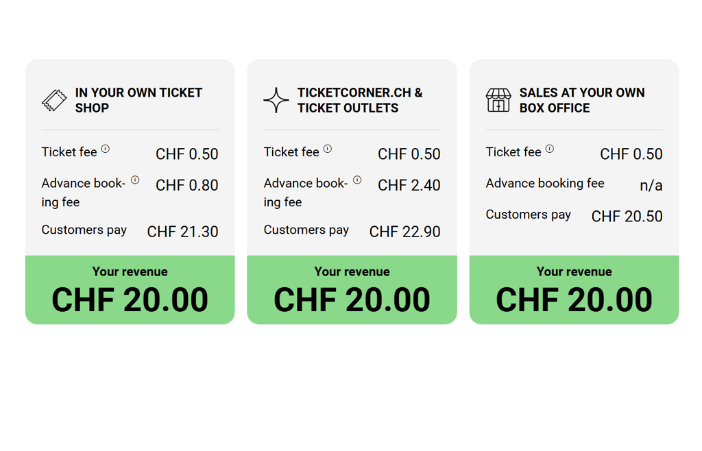 Your event, our tool for ticket sales. As an event organiser, set up your own ticket shop quickly and easily selling tickets on your own website, on ticketcorner.ch and at the box office. Start selling tickets today!