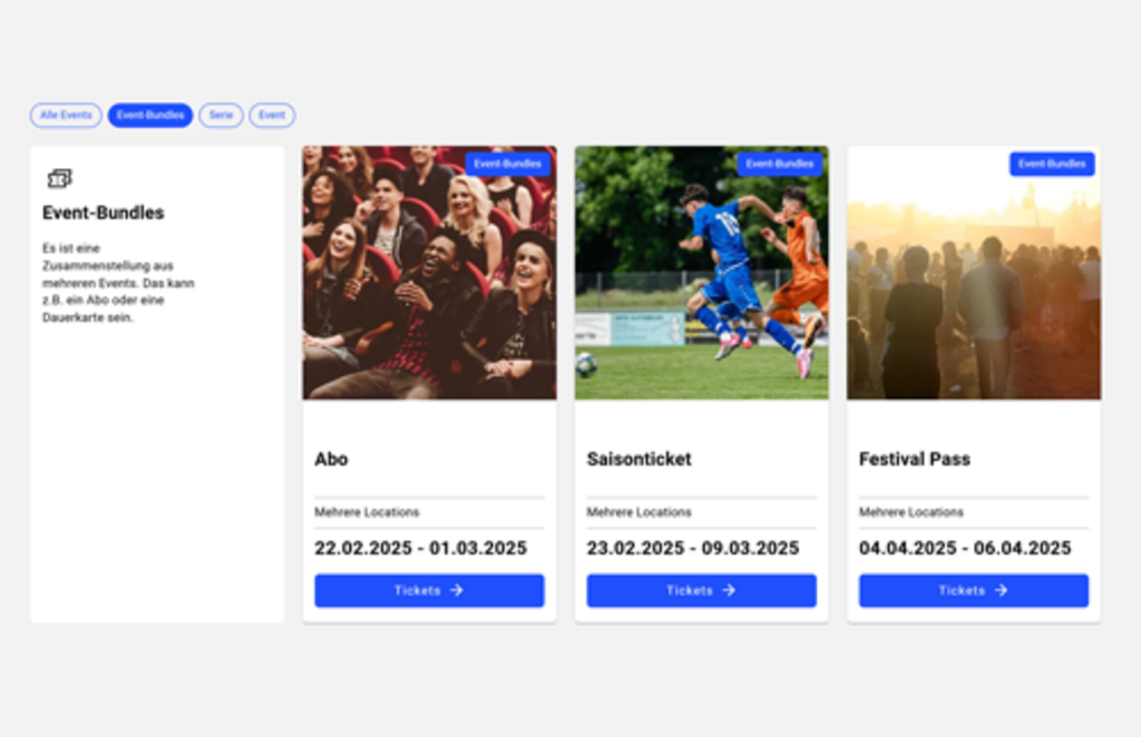 Mit dem Event-Bundle kannst du mehrere Einzelevents ganz einfach als Paket verkaufen. Füge deinem Event-Bundle bis zu 30 Einzelevents oder Termine hinzu und verkaufe dieses als Abo, Dauerkarte oder Festivalpass. Das Event-Bundle greift auf dieselben Kontingente zu wie die Einzelevents. Bestimme selbst, ob dein Bundle ein festes Set an Events enthält oder deine Käufer selbst die Termine wählen können.