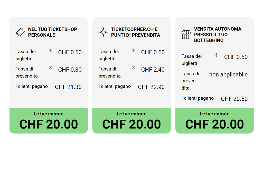 Con il nostro calcolatore dei prezzi puoi facilmente vedere quali sono i tuoi proventi per ogni canale di vendita. In questo modo, potrai anche decidere se coprire personalmente le commissioni sui biglietti o se trasferirle semplicemente ai tuoi clienti.