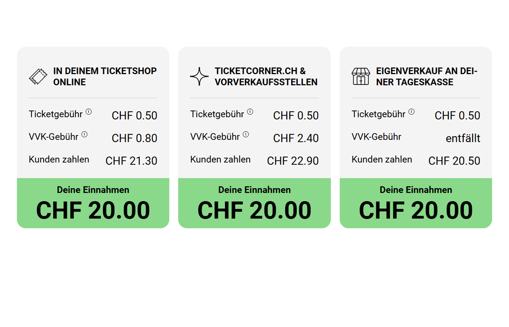 - Wenn du das Ticketcorner-Netzwerk nutzt, integrieren wir deinen Event ausserdem in die Online-Marketing Kampagnen von ticketcorner.ch.